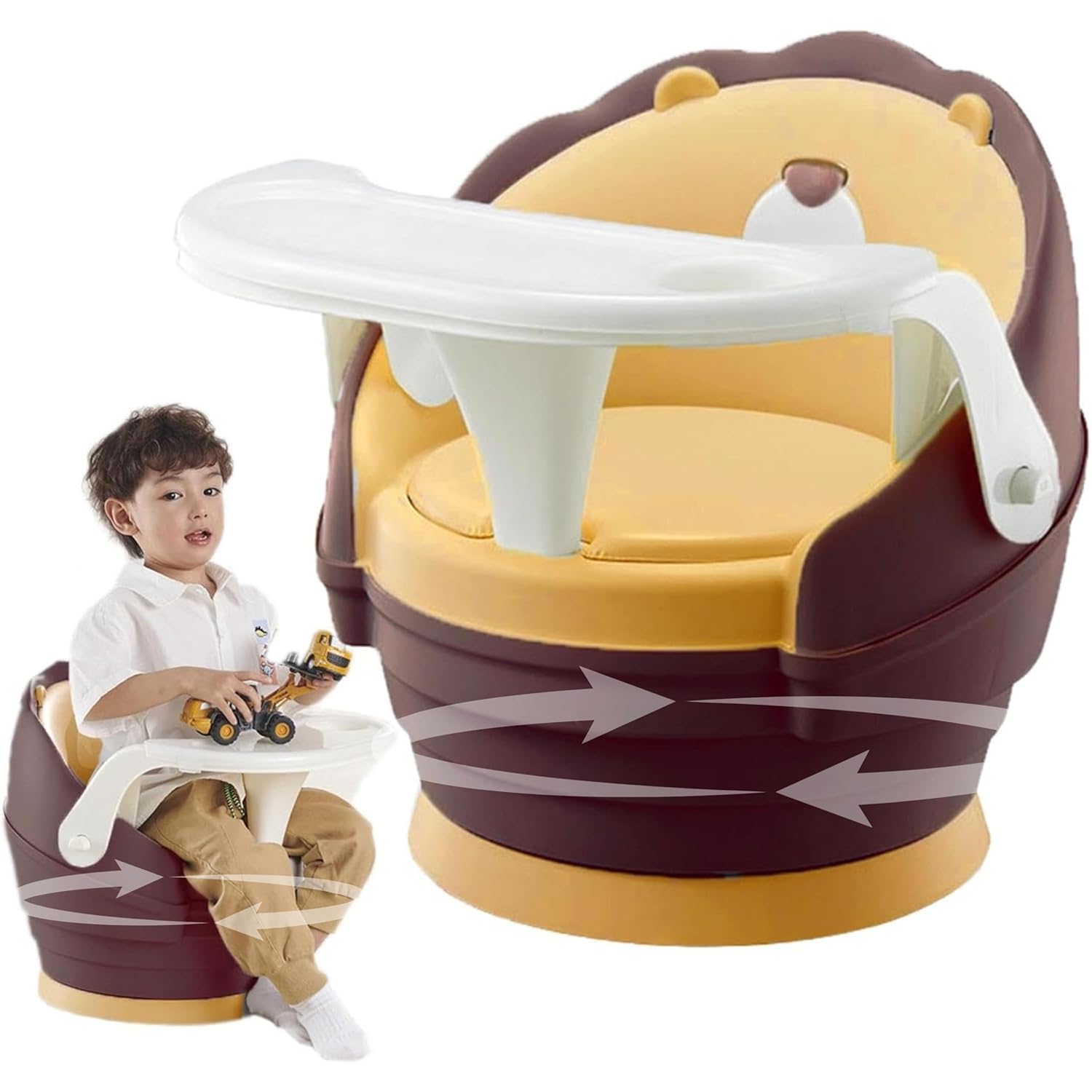 Ergonomic Seating: Provides comfort and support for the baby during feeding or playtime., Adjustable Design: Suitable for babies from 0 to 6 years, adapting to different growth stages., 360° Rotation: Allows the chair to rotate fully for easy access and convenience during mealtime., Removable Plate: Features a detachable plate for easy cleaning and versatility., Cute Voice Feature: Adds fun and entertainment for the baby during meals.